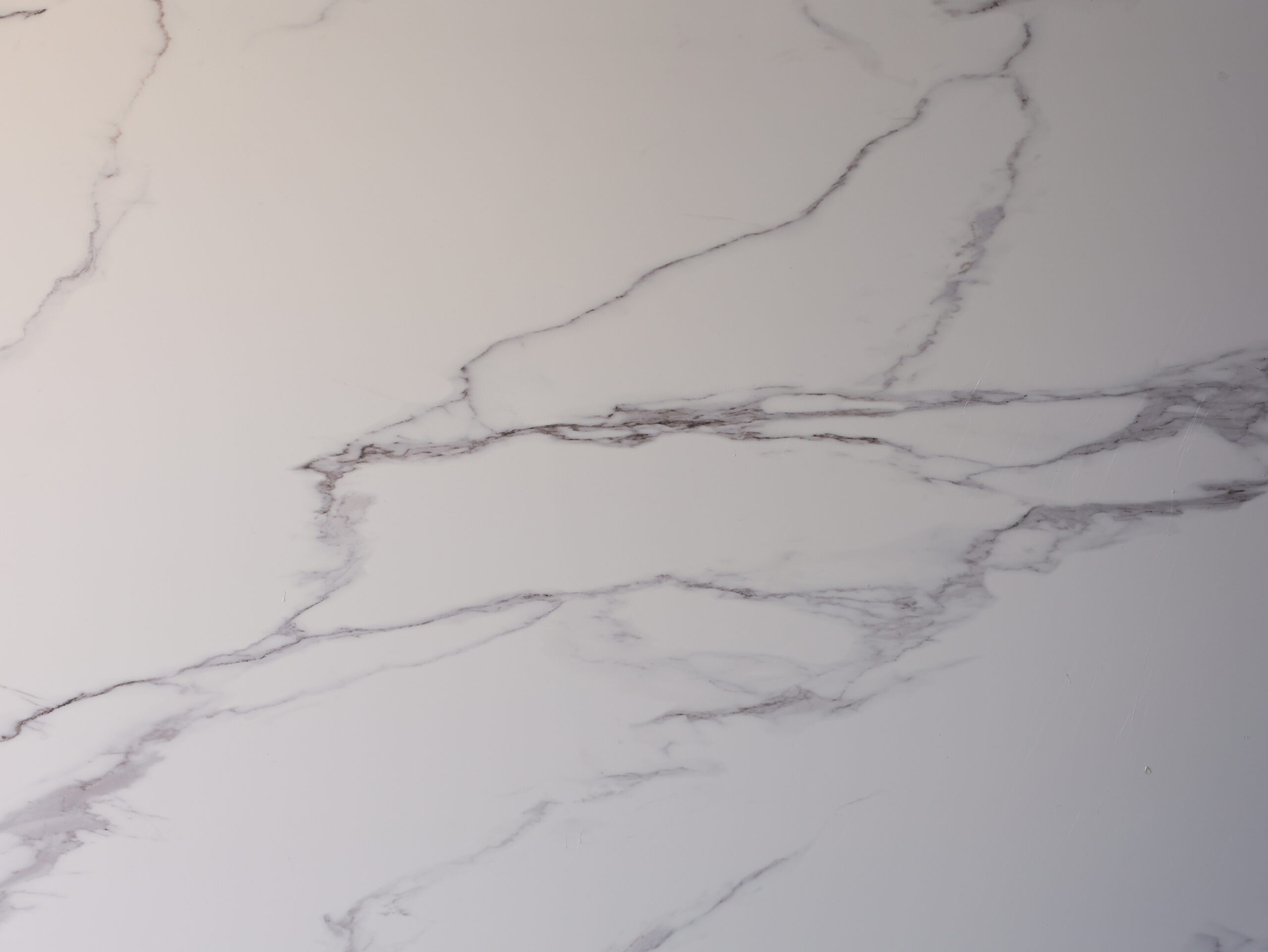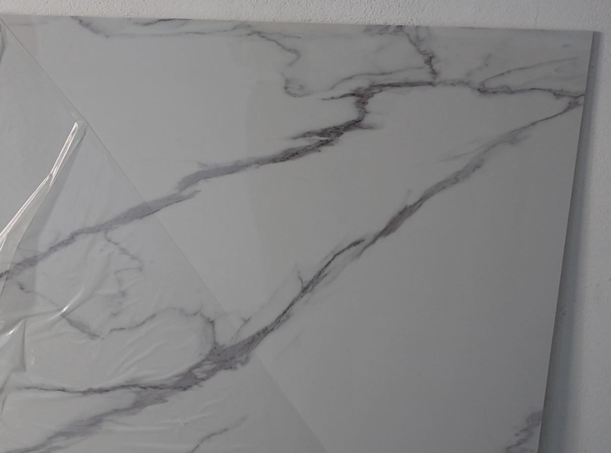 - Panel ścienny PCV marmurowy Calacatta – płyta wielkoformatowa (280×122 cm) w wykończeniu High Gloss, fabrycznie zabezpieczona technologiczną folią ochronną.